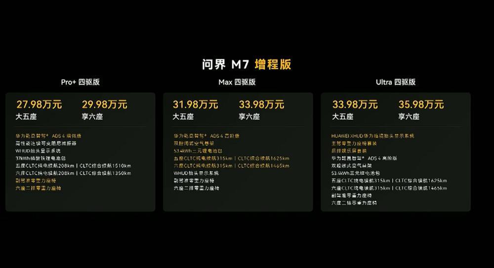 问界M7迎来改款,增程车型共分为6个版本,售价区间为27.98万元~35.98万元。