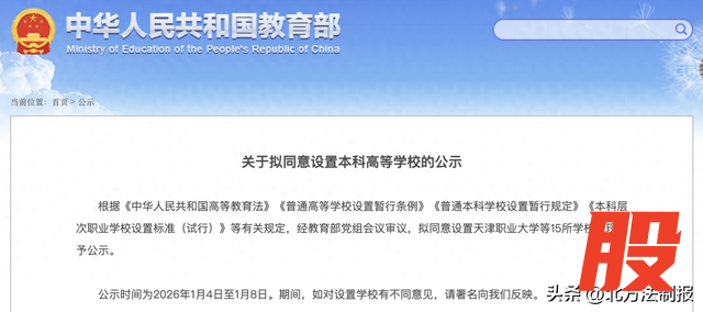 今天(4日),教育部官网发布关于拟同意设置本科高等学校的公示: