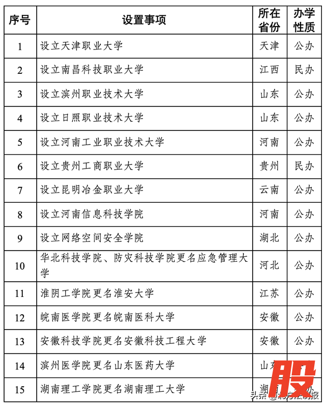 根据《中华人民共和国高等教育法》《普通高等学校设置暂行条例》《普通本科学校设置暂行规定》《本科层次职业学校设置标准(试行)》等有关规定,经教育部党组会议审议,拟同意设置天津职业大学等15所学校,现予公示。拟同意设置本科高等学校名单: